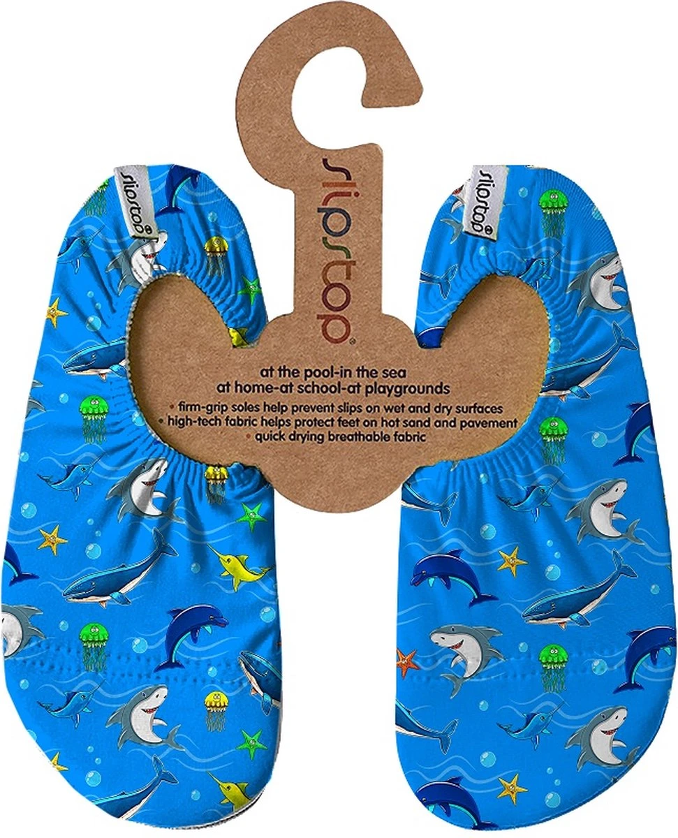 Slipstop Olympus – Licht blauw met gekleurde visjes Uitglijden op gladen vloeren is verleden tijd met Slipstop Olympus! Daarnaast verbrand je kindje zijn voetjes niet meer aan heet zand, tegels of kunstgras. De Slipstop shoes beschermen die voetjes tegen de hitte, maar ook tegen het prikken van steentjes, schelpjes en takjes. De UV beschermende stof zorgt er ook voor dat met Slipstop de voetjes niet verbranden tijdens het spelen in de zon.